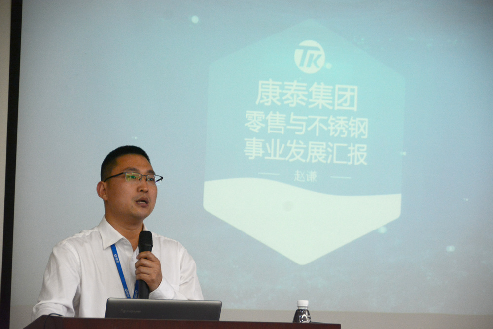 圖為會(huì)零售事業(yè)部總經(jīng)理兼不銹鋼事業(yè)部副總經(jīng)理趙謙作匯報(bào)