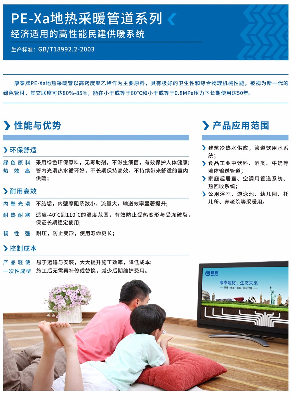 PE-Xa地?zé)岵膳苡捎诰哂泻芎玫男l(wèi)生性和綜合物理機(jī)械性能,被視為新一代的綠色管材,在西方發(fā)達(dá)國家,如英國、德國、日本等,自八十年代起,將PE-Xa地?zé)岵膳苡糜诎嬘盟蜔崴趦?nèi)的各類流體輸送管道,這些國家還制定了這類管材的國家標(biāo)準(zhǔn),以規(guī)范管材的設(shè)計、生產(chǎn)和安裝?,F(xiàn)在PE-Xa地?zé)岵膳苷谖鞣絿依^續(xù)得到廣泛的應(yīng)用。 康泰牌PE-Xa地?zé)岵膳芤愿呙芏染垡蚁┳鳛橹饕?,通過過氧化物交聯(lián)改性,將線型大分子結(jié)構(gòu)轉(zhuǎn)變?yōu)榭臻g網(wǎng)狀結(jié)構(gòu),生產(chǎn)出的PE-Xa地?zé)岵膳芙宦?lián)度可達(dá)80%-85%,可以在小于或等于60度和小于或等于0.8MPa壓力下長期使用壽命達(dá)50年。